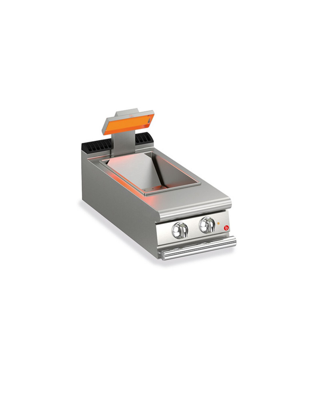 Equipement certifié pour la directive basse tension 2014/35/EU selon le schéma CB international. Grâce à la certification d'étanchéité aux jets d'eau obtenue par des tests spécifiques, les boutons et sous-boutons peuvent être lavés à la fin de la journée de travail sans compromettre la fonctionnalité et la sécurité. La barre frontale est un point d'appui confortable pour le cuisinier ; elle maintient une distance de sécurité par rapport au plan de travail et protège ainsi contre les collisions accidentelles avec ce qui repose sur les plans de travail et en même temps avec les poignees.
