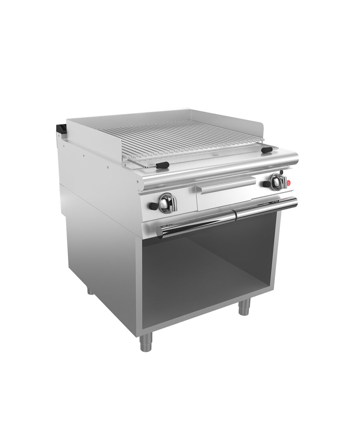 Grilles en pierre de lave : 4 types de grilles disponibles : viande, poisson, mixte en version inox et fonte réversible viande/poisson, Réglage de la hauteur du gril pour faire face aux différents types de cuisson, Plus facile à nettoyer et plus grand, Elévateurs de protection contre les éclaboussures périphériques, Canal avec trou d'évacuation et tiroir et récupération extractible des graisses et des résidus, Canal de récupération des graisses plus large et soudé sur la partie supérieure, Tiroir interne pour la récupération des résidus de carbone, Température réglable jusqu'à 350°C, Réglage de la puissance par robinet modulant à fonctionnement continu pour adapter la chaleur de la plaque au type de cuisson, Accessoire HUMIDIFICATEUR pour une gestion optimale d'un plus grand nombre de types de cuisson