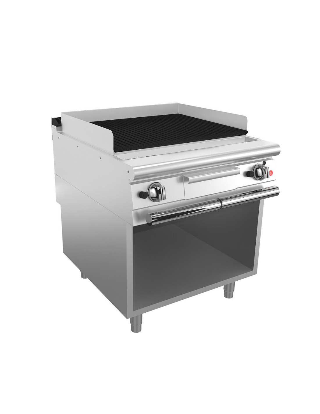Grils à gaz : 4 types de grils disponibles : viande, poisson, mixte en version inox et fonte réversible viande/poisson, Réglage de la hauteur du gril pour répondre aux différents types de cuisson, Plus facile à nettoyer et plus grand, Elévateurs de protection contre les éclaboussures sur le périmètre, Canal avec trou d'évacuation et tiroir et collecteur de graisse et de résidus amovible, Canal de collecte des graisses plus large et soudé sur le dessus, Tiroir interne pour la collecte des résidus de carbone, Température réglable jusqu'à 350°C, Réglage de la puissance par robinet modulant à fonctionnement continu pour adapter la chaleur de la plaque au type de cuisson, Accessoire HUMIDIFICATEUR pour une gestion optimale d'un plus grand nombre de types de cuissonRevêtements extérieurs et pieds en acier inoxydable.