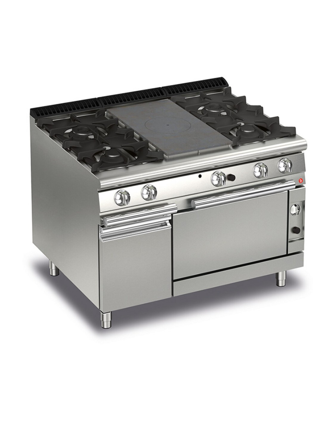 Un seul brûleur central à haut rendement qui produit des zones de chaleur différenciées sur le sol, avec une concentration de chaleur maximale au centre et des températures décroissantes dans les zones périphériques. Dessus entièrement moulé en tôle épaisse d'acier inoxydable. Grilles en fonte émaillée à longs rayons pour faciliter le déplacement des casseroles entre les feux. Brûleurs en fonte haute puissance 3,5- 5,7- 7 kW. Flamme pilote protégée par une protection amovible et facilement lavable. Grâce à la certification d'étanchéité aux jets d'eau obtenue par des tests spécifiques, les boutons et sous-boutons peuvent être lavés à la fin de la journée de travail sans compromettre la fonctionnalité et la sécurité. La barre frontale est un point d'appui confortable pour le cuisinier ; elle maintient une distance de sécurité par rapport au plan de travail et protège ainsi contre les collisions accidentelles avec ce qui repose sur les plans de travail et en même temps avec les poignees.