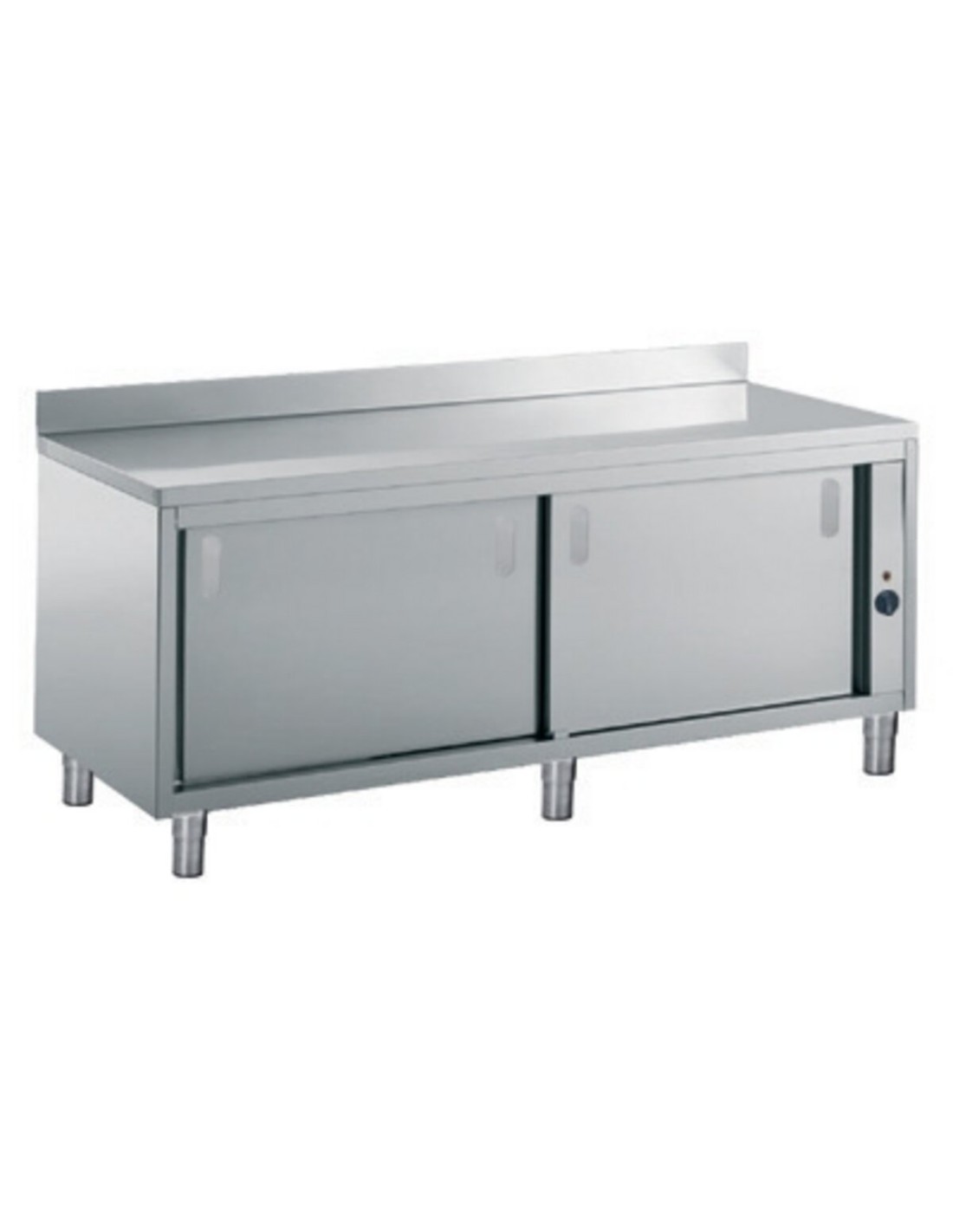 PLAN DE TRAVAIL EN ACIER INOXYDABLE 18/10 AISI 304 SB Hauteur 40 mm, Renforcé avec un panneau en bois stratifié, Dosseret 100x15 mm CORPS EN ACIER INOXYDABLE 18/10 AISI 304 Retrait par rapport au plan de 20 mm à l’avant, fil à l’arrière ÉTAGÈRE EN ACIER INOXYDABLE 18/10 AISI 304 Renfort longitudinal au centre de l'étagère réglable en hauteur sur les supports PORTES EN ACIER INOXYDABLE 18/10 AISI 304 Façade avec poignée encaissée et contre-porte intérieure GLISSIÈRES Glissement supérieur avec roulements, glissement inférieur avec patin en PVC sur glissières à double canal en PVC BATTANTES Fermeture par aimants et ouverture rotative PIED Pied rond en acier inoxydable 18/10 AISI 304, avec niveleur Exécution en acier inoxydable Scotch-Brite. Chauffage ventilé. Dosseret arrière h 100 mm Sous-plancher hydrofuge et insonorisant. Portes coulissantes insonorisées, pieds réglables, peut être équipé de roulettes 230V 1+N ; 50/60 Hz ; 2,4 Kw