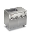 Rivestimenti esterni in acciaio inox e finitura Scotch Brite. Piani con spessore 2 mm. Cruscotti sagomati con comandi inclinati verso l’operatore. Vasca fissa completamente in acciaio. Resistenze poste sotto il fondo. Temperatura regolabile da 50 a 300°c.