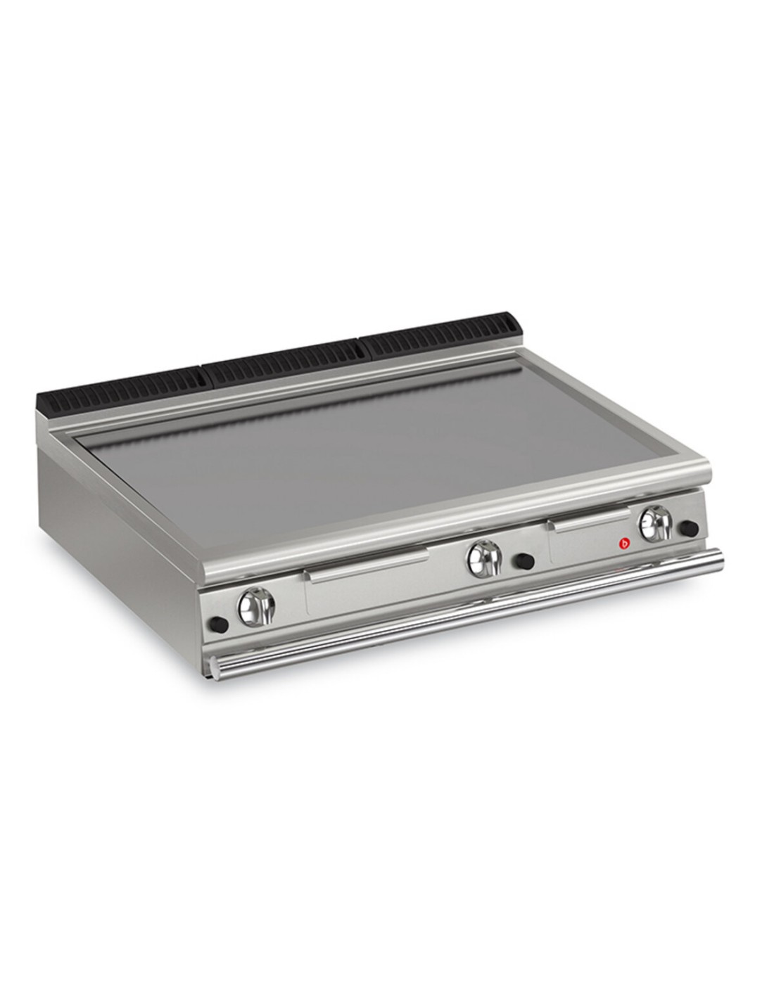 Piastra saldata al piano che garantisce una zona di cottura più ampia ed elimina zone di accumolo sporco. Distribuzione uniforme del calore grazie alla presenza di più bruciatori posti sotto la piastra. Piastra in acciaio dolce (per mercati extra UE). Regolazione della temperatura da 100°c a 280°c Grazie alla certificazione di impermeabilità ai getti d’acqua (IPX5) ottenuta attraverso test specifici, manopole e sottomanopole possono essere lavate a fine giornata di lavoro, senza comprometterne la funzionalità e la sicurezza. La barra frontale è un punto di appoggio confortevole per il cuoco; permette di rimanere alla giusta distanza di sicurezza dal piano di lavoro e quindi protegge da urti accidentali con quanto appoggiato sui piani e allo stesso tempo anche le manopole.