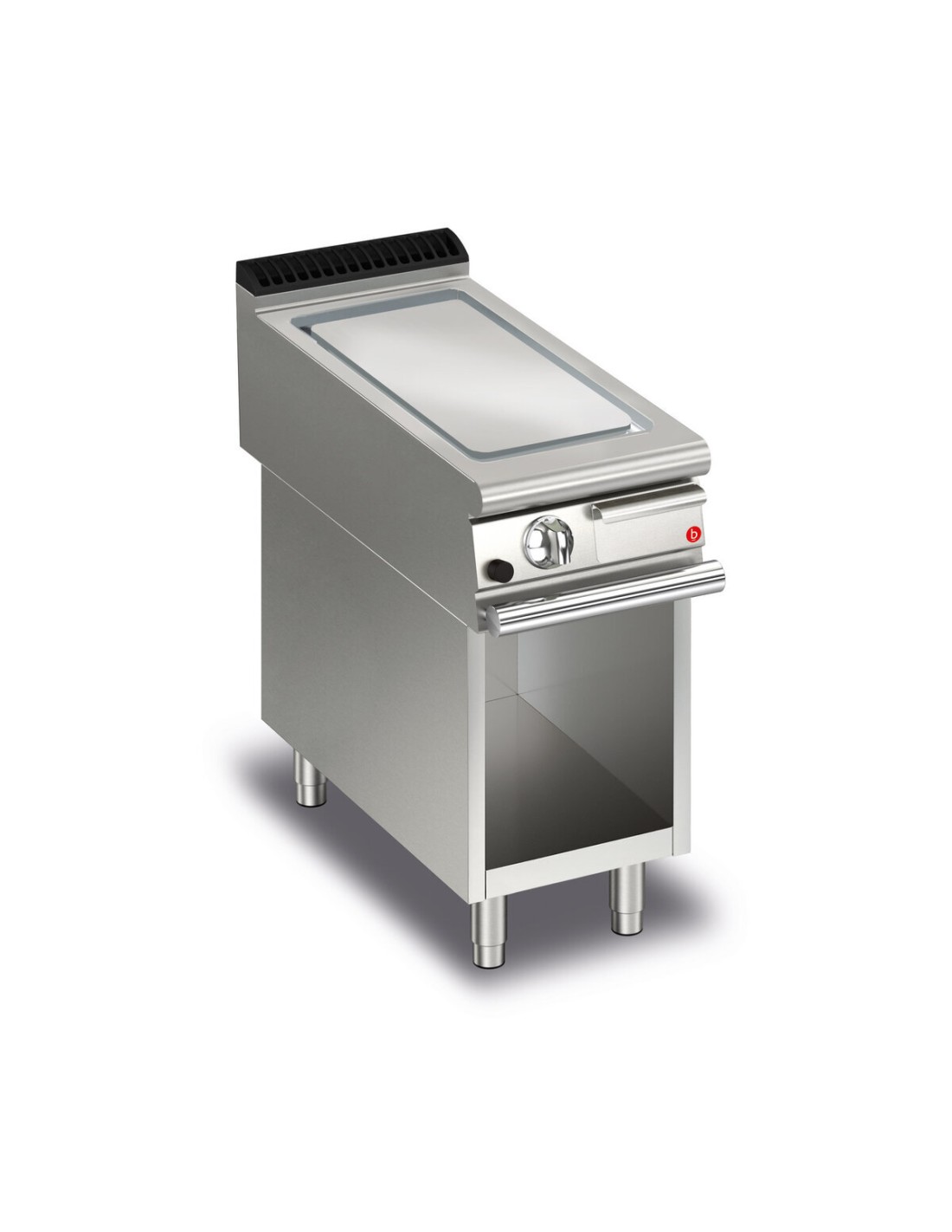 Fry top: Piastra di cottura spessore 15 mm totalmente indipendente dal piano, Ampia canalina allagabile lungo tutto il perimetro della piastra per la raccolta dei residui di cottura, inclinata verso il fronte per il deflussi dei liquidi nell'ampio cassetto raccolta grassi, Piastra non saldata per velocizzare gli interventi di manutenzione e le eventuali sostituzioni in utenza, uniformità termica, Taglio termico che agevola l'utilizzatore e i macchinari adiacenti e riduce i consumi del 15% rispetto ai modelli tradizionali .