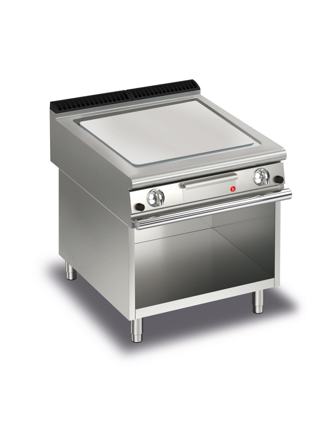 Fry top: Piastra di cottura spessore 15 mm totalmente indipendente dal piano, Ampia canalina allagabile lungo tutto il perimetro della piastra per la raccolta dei residui di cottura, inclinata verso il fronte per il deflussi dei liquidi nell'ampio cassetto raccolta grassi, Piastra non saldata per velocizzare gli interventi di manutenzione e le eventuali sostituzioni in utenza, uniformità termica, Taglio termico che agevola l'utilizzatore e i macchinari adiacenti e riduce i consumi del 15% rispetto ai modelli tradizionali .