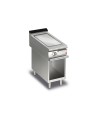 Fry top: Piastra di cottura spessore 15 mm totalmente indipendente dal piano, Ampia canalina allagabile lungo tutto il perimetro della piastra per la raccolta dei residui di cottura, inclinata verso il fronte per il deflussi dei liquidi nell'ampio cassetto raccolta grassi, Piastra non saldata per velocizzare gli interventi di manutenzione e le eventuali sostituzioni in utenza, uniformità termica, Taglio termico che agevola l'utilizzatore e i macchinari adiacenti e riduce i consumi del 15% rispetto ai modelli tradizionali .Rivestimenti esterni e piedini in acciaio INOX.