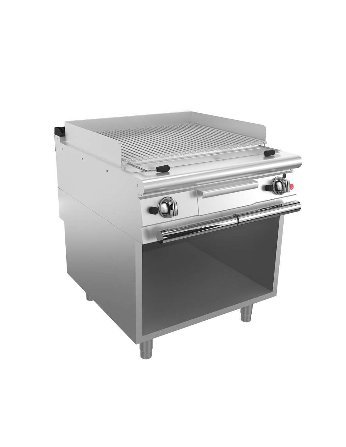 Griglie Pietra lavica: 4 Tipi Griglie disponibili: carne, pesce, mista in acciaio inox e versione in ghisa reversibile carne/pesce, Regolazione altezza griglia per la gestione di diversi tipi di cotture, più facile da pulire e più capiente, Alzatine perimetrali paraspruzzi, Canalina con foro di scarico e cassetto e raccolta grassi e residui estraibile, Canalina raccogli grasso più ampia e saldata sul piano, Cassetto interno per la raccolta dei residui carboniosi, Temperatura regolabile fino a 350°C, regolazione della potenza è affidata a un rubinetto modulabile a funzionamento continuo per adattare il calore della piastra in base al tipo di cottura, Accessorio UMIDIFICATORE per la gestione ottimale di più tipi di cotture