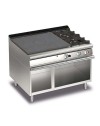 Unico bruciatore centrale ad alto rendimento che determina zone termiche differenziate sul piano con una concentrazione di massimo calore al centro e temperature decrescenti nelle zone periferiche. Piano interamente stampato e ricavato da lastra di acciaio inossidabile di grosso spessore. Griglie in ghisa smaltata a razze lunghe per un agevole spostamento delle pentole tra un fuoco e l’altro. Bruciatori in ghisa di elevata potenza 3.5- 5.7- 7 kW. Fiamma pilota protetta con protezion amovibile e facilmente lavabile. Grazie alla certificazione di impermeabilità ai getti d’acqua ottenuta attraverso test specifici, manopole e sottomanopole possono essere lavate a fine giornata di lavoro, senza comprometterne la funzionalità e la sicurezza. La barra frontale è un punto di appoggio confortevole per il cuoco; permette di rimanere alla giusta distanza di sicurezza dal piano di lavoro e quindi protegge da urti accidentali con quanto appoggiato sui piani e allo stesso tempo anche le manopole.