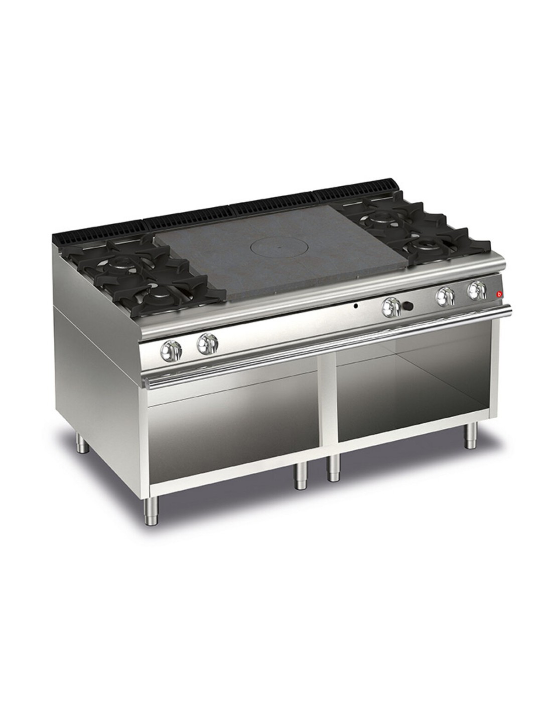 Unico bruciatore centrale ad alto rendimento che determina zone termiche differenziate sul piano con una concentrazione di massimo calore al centro e temperature decrescenti nelle zone periferiche. Piano interamente stampato e ricavato da lastra di acciaio inossidabile di grosso spessore. Griglie in ghisa smaltata a razze lunghe per un agevole spostamento delle pentole tra un fuoco e l’altro. Bruciatori in ghisa di elevata potenza 3.5- 5.7- 7 kW. Fiamma pilota protetta con protezion amovibile e facilmente lavabile. Grazie alla certificazione di impermeabilità ai getti d’acqua ottenuta attraverso test specifici, manopole e sottomanopole possono essere lavate a fine giornata di lavoro, senza comprometterne la funzionalità e la sicurezza. La barra frontale è un punto di appoggio confortevole per il cuoco; permette di rimanere alla giusta distanza di sicurezza dal piano di lavoro e quindi protegge da urti accidentali con quanto appoggiato sui piani e allo stesso tempo anche le manopole.