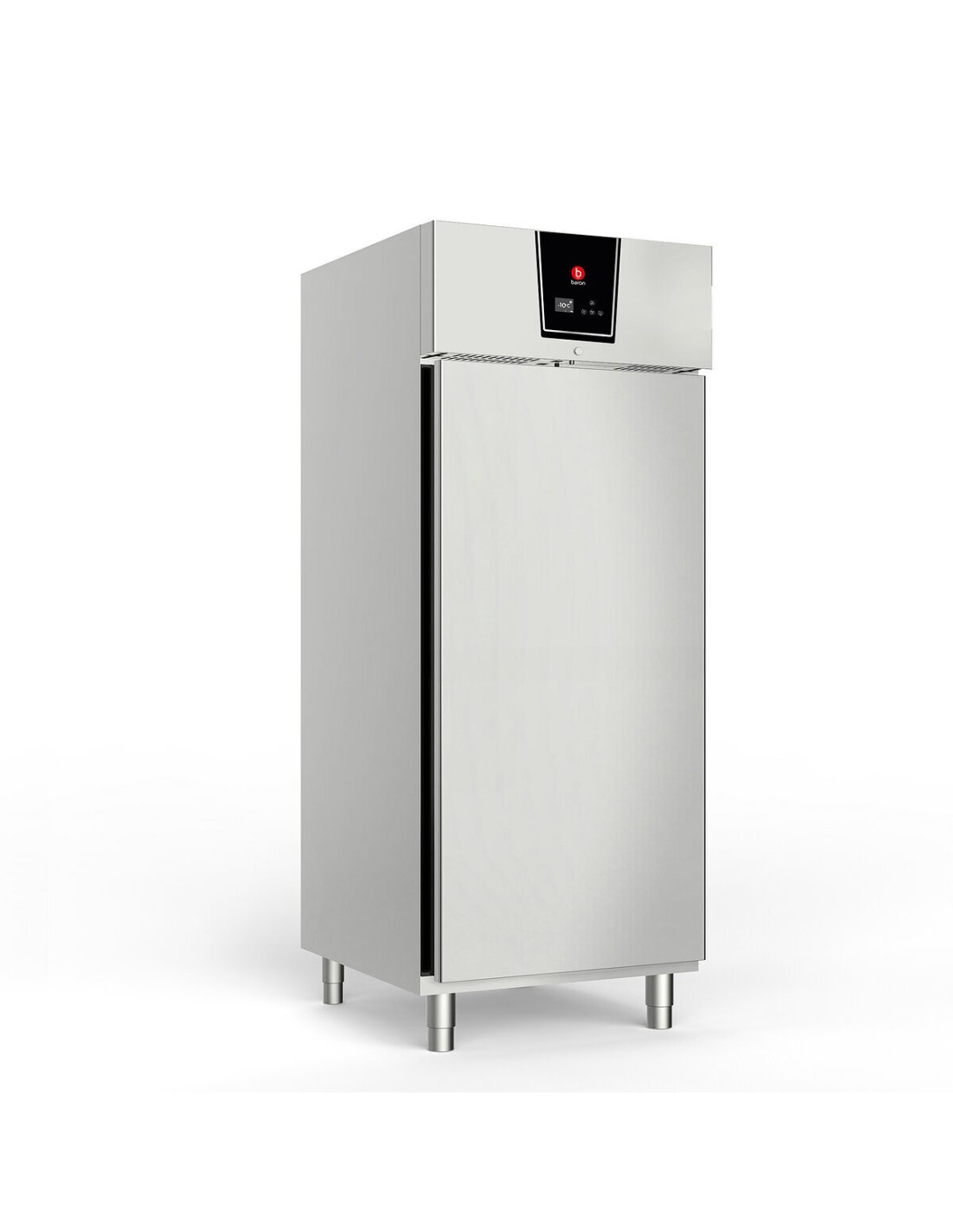 RIME LARGE di è la soluzione ideale per cucine con spazi limitati. Progettato per integrarsi perfettamente nelle linee di preparazione, offre capacità oltre al GN 2/1 e un design intelligente che garantisce efficienza, Una gamma di armadi refrigerati appositamente studiata per adattarsi a spazi ridotti e per allinearsi alle dimensioni standard delle cucine in tutto il mondo. In questa configurazione, le griglie di supporto 500x680 si inseriscono lateralmente sul lato più lungo. Il raffreddamento è garantito da un sistema ventilato con diffusore per distribuire uniformemente il freddo e assicurare una conservazione ottimale degli alimenti. Gli armadi refrigerati RIME LARGE sono progettati per adattarsi perfettamente agli spazi ristretti, grazie alla loro profondità di 76cm, che li rende ideali per gli spazi limitati. Porta USB per trasferimento di ricette e registri HACCP. Fino a 100 Ricette personalizzabili. Aggiornamento softwere tramite porta USB. Accensione luce porta anche in modalità manuale. Registro allarmi sempre aggiornato. CONNETTIVITÀ BIDIREZIONALE opzionale Interno ed esterno in acciaio inox. Isolamento pareti da 70 mm con poliuretano privo di CFC. Cruscotto apribile per facilitare la manutenzione periodica (pulizia del condensatore). Interno cella con angoli raggiati per facilitare la pulizia. Controllo con tastiera touch di tipo capacitivo e un frontale IP65 completamente liscio che ne agevola la pulizia. Piedini in acciaio da 150 mm regolabili in altezza (Hmax=160 mm - Hmin=97 mm). Sbrinamento elettrico. Porte con cerniere autochiudenti. Luce per illuminazione cella e serratura di serie. Predisposizione per posizionamento su zoccolo. Monoblocco esterno alla cella, con ventilazione forzata dall’alto verso il basso. Gruppo motore con fluido refrigerante R290. Cremagliere realizzate in acciaio inox AISI 304, facilmente smontabili, 24 posizioni, passo 59 mm. Porte in acciaio inossidabile AISI 304 dotate di cerniere, progettate per chiudersi automaticamente quando aperte a un angolo inferiore a 90°. La maniglia lunga facilita la presa e si estende lungo tutta l'altezza della porta. La guarnizione magnetica è progettata per essere rimossa con facilità.