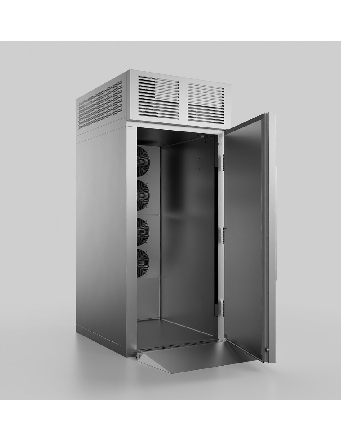 Quattro evaporatori installati all’interno della cella, dotati di ventilatori di grande diametro (30 cm), assicurano una distribuzione uniforme del freddo e un raffreddamento ottimale del prodotto presente sui carrelli a tutti i livelli.