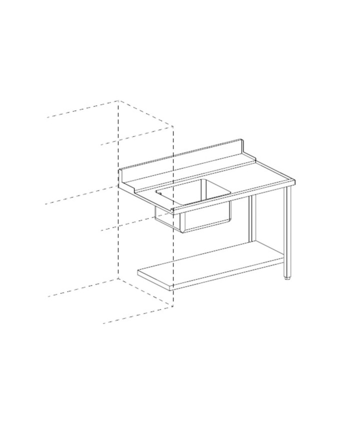 PIANO IN ACCIAIO INOX 18/10 AISI 304 SB Altezza 40 mm Alzatina 100x15 mm Invaso con sgocciolatoio stampato, vasche saldate con foro scarico, piletta e troppo pieno TELAIO Tubolare 40x40 in acciaio inox 18/10 AISI 304 spazzolato dimensioni rientranti 20 mm sui 4 lati del piano,fascia coprivasca PIEDI Quadri con livellatore, regolabili con escursione 30 mm Tavolo di prelavaggio da montare a destra della lavastoviglie, con ripiano inferiore, vasca (50x40x30 cm), troppo pieno e piletta di scarico, realizzato completamente in acciaio inox Aisi 304.