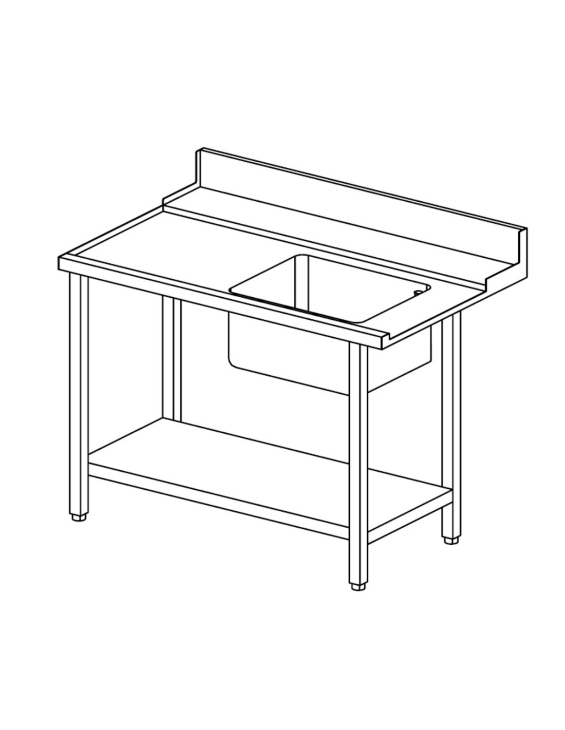 Tavolo di prelavaggio da montare a sinistra della lavastoviglie, con ripiano inferiore, vasca (50x40x30 cm), troppo pieno e piletta di scarico, realizzato completamente in acciaio inox Aisi 304.